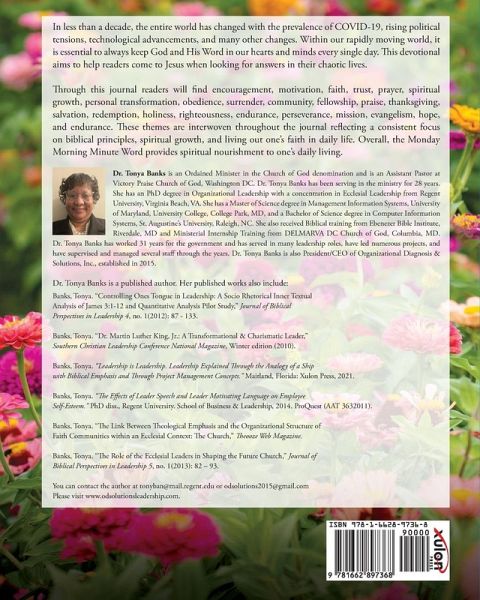 In less than a decade, the entire world has changed with the prevalence of COVID-19, rising political tensions, technological advancements, and many other changes. Within our rapidly moving world, it is essential to always keep God and His Word in our hearts and minds every single day. This devotional aims to help readers come to Jesus when looking for answers in their chaotic lives. Through this journal readers will find encouragement, motivation, faith, trust, prayer, spiritual growth, personal transformation, obedience, surrender, community, fellowship, praise, thanksgiving, salvation, redemption, holiness, righteousness, endurance, perseverance, mission, evangelism, hope, and endurance. These themes are interwoven throughout the journal reflecting a consistent focus on biblical principles, spiritual growth, and living out one's faith in daily life. Overall, the Monday Morning Minute Word provides spiritual nourishment to one's daily living. Dr. Tonya Banks is an Ordained Minister in the Church of God denomination and is an Assistant Pastor at Victory Praise Church of God, Washington DC. Dr. Tonya Banks has been serving in the ministry for 28 years. She has an PhD degree in Organizational Leadership with a concentration in Ecclesial Leadership from Regent University, Virginia Beach, VA. She has a Master of Science degree in Management Information Systems, University of Maryland, University College, College Park, MD, and a Bachelor of Science degree in Computer Information Systems, St. Augustine's University, Raleigh, NC. She also received Biblical training from Ebenezer Bible Institute, Riverdale, MD and Ministerial Internship Training from DELMARVA DC Church of God, Columbia, MD. Dr. Tonya Banks has worked 31 years for the government and has served in many leadership roles, have led numerous projects, and have supervised and managed several staff through the years. Dr. Tonya Banks is also President/CEO of Organizational Diagnosis & Solutions, Inc., established in 2015. Dr. Tonya Banks is a published author. Her published works also include: Banks, Tonya. "Controlling Ones Tongue in Leadership: A Socio Rhetorical Inner Textual Analysis of James 3:1-12 and Quantitative Analysis Pilot Study," Journal of Biblical Perspectives in Leadership 4, no. 1(2012): 87 - 133. Banks, Tonya. "Dr. Martin Luther King, Jr.: A Transformational & Charismatic Leader," Southern Christian Leadership Conference National Magazine, Winter edition (2010). Banks, Tonya. "Leadership is Leadership. Leadership Explained Through the Analogy of a Ship with Biblical Emphasis and Through Project Management Concepts." Maitland, Florida: Xulon Press, 2021. Banks, Tonya. "The Effects of Leader Speech and Leader Motivating Language on Employee Self-Esteem." PhD diss., Regent University. School of Business & Leadership, 2014. ProQuest (AAT 3632011). Banks, Tonya. "The Link Between Theological Emphasis and the Organizational Structure of Faith Communities within an Ecclesial Context: The Church," Theooze Web Magazine. Banks, Tonya. "The Role of the Ecclesial Leaders in Shaping the Future Church," Journal of Biblical Perspectives in Leadership 5, no. 1(2013): 82 - 93. You can contact the author at tonyban@mail.regent.edu or odsolutions2015@gmail.com Please visit www.odsolutionsleadership.com.
