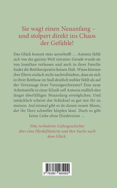 Sie wagt einen Neuanfang - und stolpert direkt ins Chaos der Gefühle!Das Glück kommt stets unverhofft ... Antonia fühlt sich von der ganzen Welt verraten: Gerade wurde sie von Jonathan verlassen und auch in ihrer Familie findet die Reittherapeutin keinen Halt. Wieso können ihre Eltern einfach nicht nachvollziehen, dass sie sich in ihrer Reithose im Stall deutlich wohler fühlt als auf der Vernissage ihrer Vorzeigeschwester? Eine neue Arbeitsstelle in einer Klinik soll Antonia endlich den längst überfälligen Neuanfang ermöglichen. Und tatsächlich scheint das Schicksal es gut mit ihr zu meinen: Auf einmal gibt es da diesen neuen Mann, der ihr Herz schneller klopfen lässt. Doch es gibt keine Liebe ohne Hindernisse ...Eine turbulente Liebesgeschichte über eine Pferdeflüsterin und ihre Suche nach dem Glück.