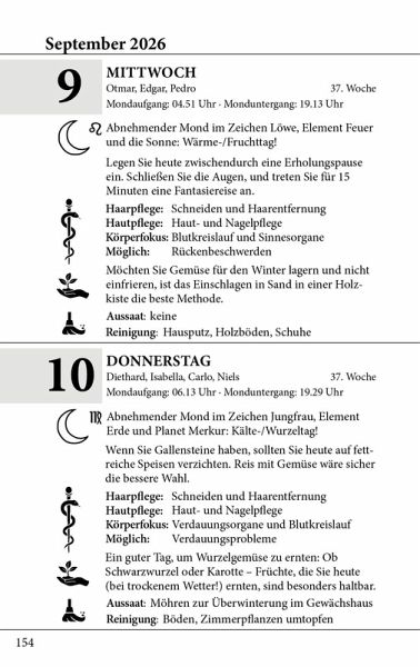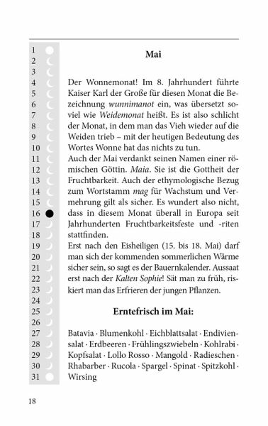 Dieser Kalender ist das Ergebnis alter Erfahrungen und Aufzeichnungen. Sie finden hier für jeden Tag des Jahres wertvolle Hinweise und Vorschläge: für Ihre Gesundheit, Ihre Fitness, Ihr Wohlbefinden, das aktuell erntefrisch erhältliche Gemüse und nicht zuletzt für die Pflanzen auf Ihrem Balkon und im Garten.