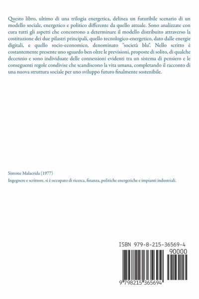 Questo libro, ultimo di una trilogia energetica, delinea un futuribile scenario di un modello sociale, energetico e politico differente da quello attuale. Sono analizzate con cura tutti gli aspetti che concorrono a determinare il modello distribuito attraverso la costituzione dei due pilastri principali, quello tecnologico-energetico, dato dalle energie digitali, e quello socio-economico, denominato "società blu". Nello scritto è costantemente presente uno sguardo ben oltre le previsioni, proposte di solito, di qualche decennio e sono individuate delle connessioni evidenti tra un sistema di pensiero e le conseguenti regole condivise che scandiscono la vita umana, completando il racconto di una nuova struttura sociale per uno sviluppo futuro finalmente sostenibile.