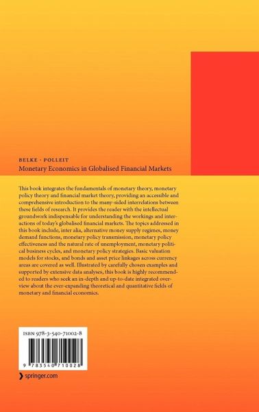 This book integrates the fundamentals of monetary theory, monetary policy theory and financial market theory, providing an accessible and comprehensive introduction to the many-sided interrelations between these fields of research. It provides the reader with the intellectual groundwork indispensable for understanding the workings and interactions of today's globalised financial markets. The topics addressed in this book include, inter alia, alternative money supply regimes, money demand functions, monetary policy transmission, monetary policy effectiveness and the natural rate of unemployment, monetary political business cycles, and monetary policy strategies. Basic valuation models for stocks, and bonds and asset price linkages across currency areas are covered as well. Illustrated by carefully chosen examples and supported by extensive data analyses, this book is highly recommended to readers who seek an in-depth and up-to-date integrated overview about the ever-expanding theoretical and quantitative fields of monetary and financial economics.