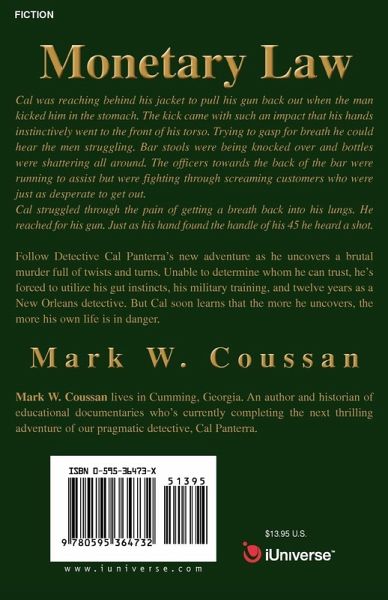 Cal was reaching behind his jacket to pull his gun back out when the man kicked him in the stomach. The kick came with such an impact that his hands instinctively went to the front of his torso. Trying to gasp for breath he could hear the men struggling. Bar stools were being knocked over and bottles were shattering all around. The officers towards the back of the bar were running to assist but were fighting through screaming customers who were just as desperate to get out. Cal struggled through the pain of getting a breath back into his lungs. He reached for his gun. Just as his hand found the handle of his 45 he heard a shot. Follow Detective Cal Panterra's new adventure as he uncovers a brutal murder full of twists and turns. Unable to determine whom he can trust, he's forced to utilize his gut instincts, his military training, and twelve years as a New Orleans detective. But Cal soon learns that the more he uncovers, the more his own life is in danger.