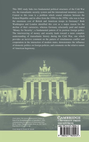 This study links two fundamental political structures of the Cold War era, the transatlantic security system and the international monetary system. Central to this issue is a problem which soured relations between the Federal Republic and its allies from the 1950s to the 1970s: who was to bear the enormous cost of British and American troops in Germany? Both Washington and London identified this cost as a major reason for the decline of their currencies, whereas Germany reluctantly paid and traded 'Money for Security'; a fundamental pattern of its postwar foreign policy. The interweaving of money and security leads toward a more complete understanding of transatlantic history during the Cold War, one which provides an incisive comment on the pattern of simultaneous conflict and cooperation in the interaction of modern states, demonstrates the influence of domestic politics on foreign policies, and comments on the relative nature of American hegemony.