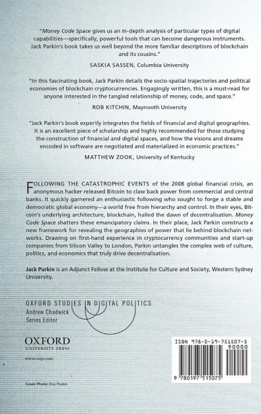 Following the catastrophic events of the 2008 global financial crisis, an anonymous hacker released Bitcoin to claw back power from commercial and central banks. It quickly garnered an enthusiastic following who sought to forge a stable and democratic global economy--a world free from hierarchy and control. In their eyes, Bitcoin's underlying architecture, blockchain, hailed the dawn of decentralisation. Money Code Space shatters these emancipatory claims. In their place, Jack Parkin constructs a new framework for revealing the geographies of power that lie behind blockchain networks. Drawing on first-hand experience in cryptocurrency communities and start-up companies from Silicon Valley to London, Parkin untangles the complex web of culture, politics, and economics that truly drive decentralisation.