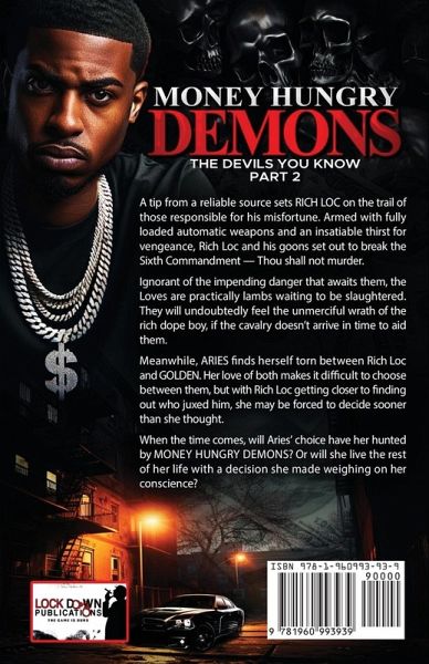 A tip from a reliable source sets RICH LOC on the trail of those responsible for his misfortune. Armed with fully loaded automatic weapons and an insatiable thirst for vengeance, Rich Loc and his goons set out to break the Sixth Commandment - Thou shall not murder. Ignorant of the impending danger that awaits them, the Loves are practically lambs waiting to be slaughtered. They will undoubtedly feel the unmerciful wrath of the rich dope boy, if the cavalry doesn't arrive in time to aid them. Meanwhile, ARIES finds herself torn between Rich Loc and GOLDEN. Her love of both makes it difficult to choose between them, but with Rich Loc getting closer to finding out who juxed him, she may be forced to decide sooner than she thought. When the time comes, will Aries' choice have her hunted by MONEY HUNGRY DEMONS? Or will she live the rest of her life with a decision she made weighing on her conscience?