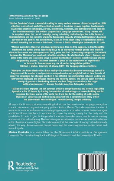Money in the House provides a pompelling look at how the drive to raise campaign money has come to dominate congressional party politics. Currinder examines the rise of member-to-member and member-to-party giving as part of a broader process that encourages ambitious House members to compete for power by raising money for the party and its candidates.