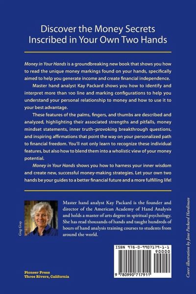 Discover the Money Secrets Inscribed in Your Own Two Hands Money in Your Hands is a groundbreaking new book that shows you how to read the unique money markings found on your hands, specifically aimed to help you generate income and create financial independence. Master hand analyst Kay Packard shows you how to identify and interpret more than 100 line and marking configurations to help you determine which ones are in your hands and understand your personal relationship to money and how to use it to your best advantage. These features of the palms, fingers, and thumbs are described and analyzed, highlighting their associated strengths and pitfalls, money mindset statements, inner truth-provoking breakthrough questions, and inspiring affirmations that point the way on your personalized path to financial freedom. You'll not only learn to recognize these individual features, but also how to blend them into a wholistic view of your money potential. Money in Your Hands shows you how to harness your inner wisdom and create new, successful money-making strategies. Why would everyone have unique designs imprinted in their hands unless they were meant to be read? Let your own two hands be your guides to a better financial future and more fulfilling life!