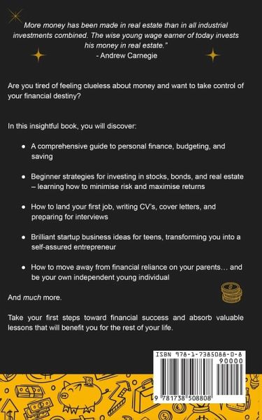 Discover the exciting world of personal finance and investing - uncover your hidden potential for financial success as early as now! Are you tired of feeling clueless about money and want to take control of your financial destiny? Do you want in on the secrets to building long-term wealth and securing a prosperous future, one where you don't have to stress about whether or not you can afford the life you want? Are you ready to unlock the keys to financial independence and turn your dreams into reality, without having to depend on your parents? Navigating the complex world of finance can be intimidating, especially when bombarded with unfamiliar terms and lack of education and experience. But here's the secret: it's never too early to sharpen your finance skills. In fact, the earlier the better! By starting now, you gain a remarkable advantage. You can begin with small steps, learning from your mistakes without suffering any major consequences. You also have the luxury of time to compound your investments and watch your wealth grow exponentially. This captivating guide breaks down the barriers that stand between you and your financial success. It presents a practical roadmap, demystifying the financial landscape and equipping you with the knowledge and skills to venture with confidence. In this insightful book, you will discover: A comprehensive guide to personal finance, budgeting, and saving (and why it matters!) Tips on building financial literacy and becoming confident in making smart money decisions - without feeling overwhelmed Beginner strategies for investing in stocks, bonds, and real estate - learning how to minimise risk and maximise returns Step-by-step instructions for creating a personal financial plan and setting goals that actually stick How to land your first job, writing CV's, cover letters, and preparing for interviews; plus job and internship examples and breakdowns Brilliant startup business ideas for teens and young adults, transforming you into a self-assured entrepreneur How to move away from financial reliance on your parents... and be your own independent young individual And much more. You might think that personal finance and investing are for adults or millionaires only. But the truth is, anyone can learn and master the game of money, including you. With the right mindset, knowledge, and skills, you can achieve financial freedom and live the life you want. Starting with this guide, you can take your first steps toward financial success and absorb valuable lessons that will benefit you for the rest of your life. If you're ready to take control of your financial future and start building wealth as a teen or young adult, then scroll up and click "Add to Cart" right now!