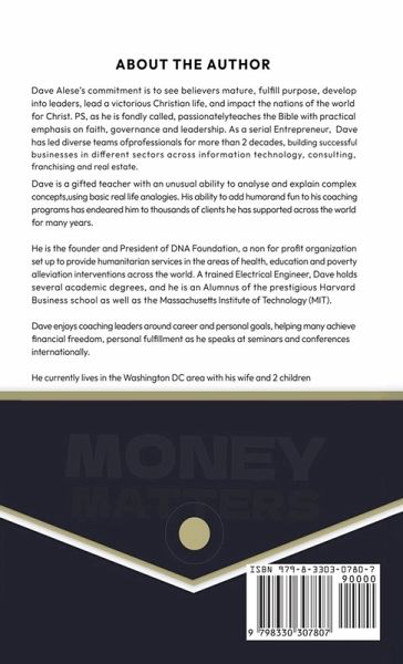 Take Control of Your Financial Future with "MONEY MATTERS" by Dave Alese Are you ready to master your finances and build a secure future? "MONEY MATTERS" by Dave Alese is your comprehensive guide to understanding and managing your money, empowering you to achieve financial freedom and success. Why You'll Love "MONEY MATTERS":Expert Advice: Gain insights from Dave Alese, a seasoned financial expert, on managing your finances effectively. Practical Strategies: Learn actionable steps to save, invest, and grow your wealth. Financial Literacy: Enhance your understanding of key financial concepts and principles. What You'll Discover Inside:Budgeting and Saving: Discover techniques for creating a budget, cutting unnecessary expenses, and saving money consistently. Investing Wisely: Learn how to make smart investment decisions, diversify your portfolio, and maximize returns.