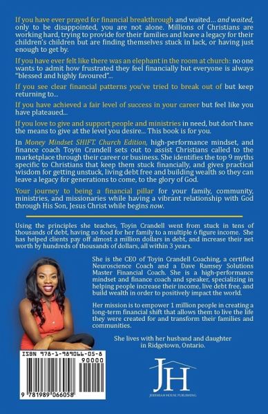 If you have ever prayed for financial breakthrough and waited… and waited, only to be disappointed, you are not alone. Millions of Christians are working hard, trying to provide for their families and leave a legacy for their children’s children but are finding themselves stuck in lack, or having just enough to get by. If you have ever felt like there was an elephant in the room at church: no one wants to admit how frustrated they feel financially but everyone is always "blessed and highly favoured"... If you see clear financial patterns you’ve tried to break out of but keep returning to... If you have achieved a fair level of success in your career but feel like you have plateaued... If you love to give and support people and ministries in need, but don’t have the means to give at the level you desire... This book is for you. In Money Mindset SHIFT. Church Edition, high-performance mindset, and finance coach Toyin Crandell sets out to assist Christians called to the marketplace through their career or business. By identifying the top 9 myths specific to Christians that keep them stuck financially, she gives practical wisdom for getting unstuck, living debt free and building wealth so they can leave a legacy for generations to come, to the glory of God. Your journey in being a financial pillar for your family, community, ministries, and missionaries while having a vibrant relationship with God through His Son, Jesus Christ begins now.