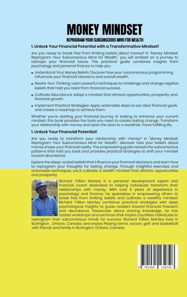 1) Unlock Your Financial Potential with a Transformative Mindset! Are you ready to break free from limiting beliefs about money? In "Money Mindset: Reprogram Your Subconscious Mind for Wealth," you will embark on a journey to reshape your financial future. This practical guide combines insights from psychology and personal finance to help you: ¿ Understand Your Money Beliefs: Discover how your subconscious programming influences your financial decisions and overall wealth. ¿ Rewire Your Thinking: Learn powerful techniques to challenge and change negative beliefs that hold you back from financial success. ¿ Cultivate Abundance: Adopt a mindset that attracts opportunities, prosperity, and financial growth. ¿ Implement Practical Strategies: Apply actionable steps to set clear financial goals and create a roadmap to achieve them. Whether you're starting your financial journey or looking to enhance your current mindset, this book provides the tools you need to create lasting change. Transform your relationship with money and open the door to a wealthier, more fulfilling life. 2) Unlock Your Financial Potential! Are you ready to transform your relationship with money? In "Money Mindset: Reprogram Your Subconscious Mind for Wealth," discover how your beliefs about money shape your financial reality. This empowering guide reveals the subconscious patterns that hold you back and provides practical strategies to shift your mindset toward abundance. Explore the deep-rooted beliefs that influence your financial decisions and learn how to reprogram your thoughts for lasting change. Through insightful exercises and actionable techniques, you'll cultivate a wealth mindset that attracts opportunities and prosperity.