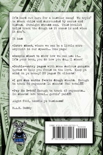 It's hard out here for a hustler mang! We tryin' ta stack chips and surrounded by marks and bustas. Straight stress man. This booklet helps track the dough as it comes in and when it don't. It has: *Intro sheet, where we can be a little more explicit in our speech... [one page] *Sample sheet ta show how we can use it... It's your book, you do how you do... (1 sheet) *Double-entry pages with some serious gangsta quotes to help you focus on the loot. Keep ya mind on ya money! (25 pages [50 clients]) *I got sum mutha f*ckin dough sheets. Enough ta track 54 payments (10 sheets) [540 total!!!!] *Pay Me B*tch! Enough ta track 43 payments... (10 sheets) [430 total... gettin' paid!!!] Aight fool, handle ya business!