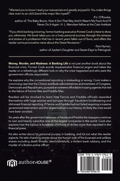Money, Murder, and Madness: A Banking Life is not just another book about the financial crisis. Forrest Cook avoids impenetrable financial jargon and takes the reader on a refreshingly different look on why the crisis happened and who were the government officials responsible. He explains why the conventional reporting is misleading or wrong. Cook makes a convincing case that the Clinton and Bush administrations and members of Congress, Democrats and Republicans, pursued an extreme affordable housing agenda that led to the failure of Fannie Mae and Freddie Mac. Readers will be shocked to learn how Fannie and Freddie officials rewarded themselves with huge salaries and bonuses through fraudulent bookkeeping and dishonest financial reporting. If Fannie and Freddie had not failed requiring a massive government intervention and the largest bailout in our history, it's likely the crisis would have been avoided. Six years after the government takeover of Fannie and Freddie the taxpayers continue to own and heavily subsidize one of the largest companies in the world. Cook also explains how the bailout is hundreds of billions of dollars more than reported in the financial press. He also writes about his personal journey in banking, and it's not what the reader expects. He tells charming stories about the human side of the business and unlikely events including death threats, demonstrations, a violent bank robbery, and the murder of a Boston police officer.