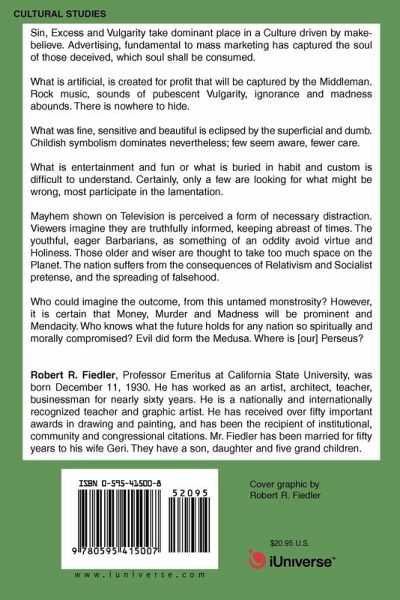 Sin, Excess and Vulgarity take dominant place in a Culture driven by makebelieve. Advertising, fundamental to mass marketing has captured the soul of those deceived, which soul shall be consumed. What is artificial, is created for profit that will be captured by the Middleman. Rock music, sounds of pubescent Vulgarity, ignorance and madness abounds. There is nowhere to hide. What was fine, sensitive and beautiful is eclipsed by the superficial and dumb. Childish symbolism dominates nevertheless; few seem aware, fewer care. What is entertainment and fun or what is buried in habit and custom is difficult to understand. Certainly, only a few are looking for what might be wrong, most participate in the lamentation. Mayhem shown on Television is perceived a form of necessary distraction. Viewers imagine they are truthfully informed, keeping abreast of times. The youthful, eager Barbarians, as something of an oddity avoid virtue and Holiness. Those older and wiser are thought to take too much space on the Planet. The nation suffers from the consequences of Relativism and Socialist pretense, and the spreading of falsehood. Who could imagine the outcome, from this untamed monstrosity? However, it is certain that Money, Murder and Madness will be prominent and Mendacity. Who knows what the future holds for any nation so spiritually and morally compromised? Evil did form the Medusa. Where is [our] Perseus?