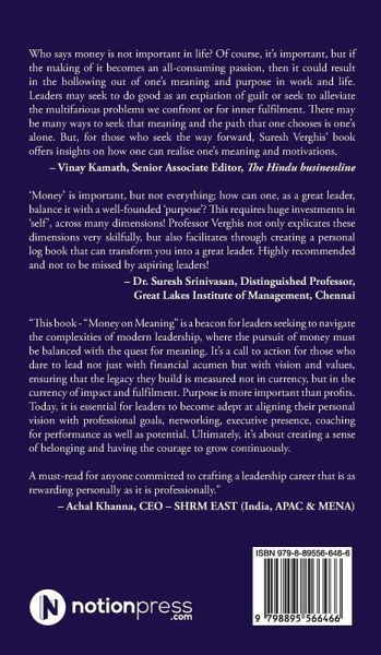 Who says money is not important in life? Of course, it's important, but if the making of it becomes an all-consuming passion, then it could result in the hollowing out of one's meaning and purpose in work and life. Leaders may seek to do good as an expiation of guilt or seek to alleviate the multifarious problems we confront or for inner fulfilment. There may be many ways to seek that meaning and the path that one chooses is one's alone. But, for those who seek the way forward, Suresh Verghis' book offers insights on how one can realise one's meaning and motivations. - Vinay Kamath, Senior Associate Editor, The Hindu businessline 'Money' is important, but not everything; how can one, as a great leader, balance it with a well-founded 'purpose'? This requires huge investments in 'self', across many dimensions! Professor Verghis not only explicates these dimensions very skilfully, but also facilitates through creating a personal log book that can transform you into a great leader. Highly recommended and not to be missed by aspiring leaders! - Dr. Suresh Srinivasan, Distinguished Professor, Great Lakes Institute of Management, Chennai