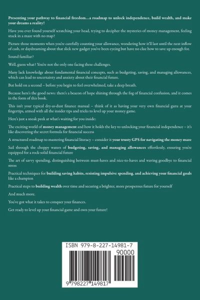 Presenting your pathway to financial freedom...a roadmap to unlock independence, build wealth, and make your dreams a reality! Have you ever found yourself scratching your head, trying to decipher the mysteries of money management, feeling stuck in a maze with no map? Picture those moments when you're carefully counting your allowance, wondering how it'll last until the next inflow of cash, or daydreaming about that slick new gadget you've been eyeing but have no clue how to save up enough for. Sound familiar? Well, guess what? You're not the only one facing these challenges. Many lack knowledge about fundamental financial concepts, such as budgeting, saving, and managing allowances, which can lead to uncertainty and anxiety about their financial future. But hold on a second - before you begin to feel overwhelmed, take a deep breath. Because here's the good news: there's a beacon of hope shining through the fog of financial confusion, and it comes in the form of this book. This isn't your typical dry-as-dust finance manual - think of it as having your very own financial guru at your fingertips, armed with all the insider tips and tricks to level up your money game. Here's just a sneak peek at what's waiting for you inside: The exciting world of money management and how it holds the key to unlocking your financial independence - it's like discovering the secret formula for financial success A structured roadmap to mastering financial literacy - consider it your trusty GPS for navigating the money maze Sail through the choppy waters of budgeting, saving, and managing allowances effortlessly, ensuring you're equipped for a rock-solid financial future The art of savvy spending, distinguishing between must-haves and nice-to-haves and waving goodbye to financial stress Practical techniques for building saving habits, resisting impulsive spending, and achieving your financial goals like a champion Practical steps to building wealth over time and securing a brighter, more prosperous future for yourself And much more. You've got what it takes to conquer your finances. Get ready to level up your financial game and own your future!