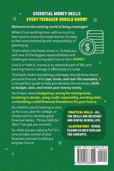 The Teenage years are critical for learning, understanding the world, and discovering new hobbies and passions. It is a period of self-discovery during which adolescents learn more about themselves and their place in the world. These are exciting times, but they may also be intimidating. It's easy to feel overwhelmed by the responsibilities of growing up, with so much to learn and so many new experiences. This is where this book comes into play. To assist kids in navigating one of the most important things that every young adult must face: money. In this book, Ferne Bowe (author of Life Skills for Young Adults and Life Skills for Tweens) covers everything a teen needs to know about money, from budgeting and saving to investing and credit scores. The book provides practical guidance to help kids build a healthy relationship with money by using real-life examples and simple language. This book covers everything from budgeting and emergency savings to investing in stocks and utilizing credit wisely. ¿¿Money Skills for Teens is the go-to beginner's guide to personal finance for teenagers. Providing them with a solid foundation of money skills, knowledge, and experiences to help them make wise financial decisions.If you like simple, practical, and real-world advice, you'll love this book.