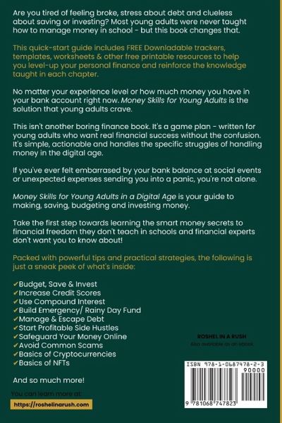 Tired of Being Broke? Let's Fix That. Ever feel like your money disappears faster than you can say "payday"? If you're ready to stop stressing about cash and start living the life you deserve, Money Skills for Young Adults in a Digital Age is here to help you level up your financial game. No boring lectures. No confusing jargon. Just straight-up practical advice to help you save big, spend smart, and still have money for those late-night pizza runs or spontaneous weekend trips. Why This Book is Your Secret Weapon:FREE tools like trackers, templates, and worksheets to keep you organized and on track. No matter how much (or how little) you've got in your bank account, this book's got your back. It's written for you, tackling real struggles like managing money in a world of online shopping, FOMO, and surprise expenses. Sound familiar?Embarrassed about checking your balance at brunch? Freaked out by an unexpected bill? Got debt you don't know how to deal with? Yeah, I've been there. But this guide is packed with real solutions for all of that. Here's Just a Taste of What You'll Learn: How to budget, save, and invest like a pro Tips to boost your credit score Using compound interest to grow your money (it's like free money, seriously) Building a rainy-day fund for emergencies Escaping and managing debt Starting side hustles to stack cash Taxes made simple (finally!) How to protect yourself online from scams Basics of cryptocurrencies and NFTs (because, yes, they're a thing) And so much more! Why This Book? It's the stuff they should've taught us in school, but didn't. And it's all broken down in a way that's easy to understand and fun to follow. Ready to get your money in check and start building a future you're proud of? Grab your copy of Money Skills for Young Adults in a Digital Age today and take the first step toward being financially fearless. Your future self is already high-fiving you for this move.
