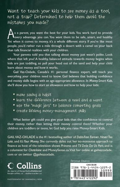 As a parent you want the best for your kids. You work hard to provide every advantage you can. You want them to be safe, smart and healthy. Yet, when it comes to money, it's a whole different story. If you're like most people, you'd rather run a mile through a desert with a camel on your back than talk financial realities with your children.Your parents told you that talking about money just wasn't polite. Look where that left you! A healthy, balanced attitude towards money begins when kids are just toddling, so pull your head out of the sand and roll up your sleeves. Gail Vaz-Oxlade, Canada's #1 personal finance expert, will teach you everything your children need to know. Gail believes that building confidence and money skills starts with an age-appropriate allowance. In Money-Smart Kids, she'll show you how to start an allowance and use it effectively to help your kids: * make saving a habit * learn the difference between a need and a want * use the "magic jars" to balance competing goals * create life-long money management skills What better gift could you give your kids than the confidence to control their money, rather than letting their money control them? Let Gail help you raise Money-Smart Kids.