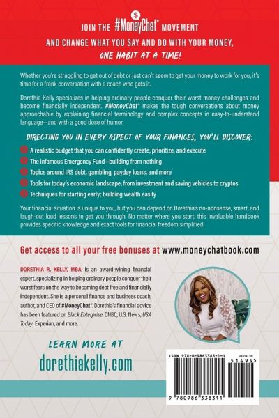 Join the #MoneyChat® movement and change what you say and do with your money, one habit at a time! It's easy to fall down the negativity hole when it comes to money. Whether it's worrying you don't have enough for bills, struggle to get out debt, haven't saved enough, or just plain don't get how to make your money grow-the stress can tear up your mindset around money. It's time for a real conversation with a coach who gets it. Nationally-recognized award-winning financial expert Dorethia Kelly specializes in helping ordinary people conquer their worst money challenges and become financially independent. #MoneyChat® makes the tough conversations about money approachable by explaining financial terminology and complex concepts in easy-to-understand language-and with a good dose of humor. Erase the shame from past mistakes and adjust what you SAY and DO with your money to live a financially free life. You'll discover:Ways to crush student loans at your own pace with four critical action steps Topics you don't normally see in financial freedom books, including how to get out of IRS debt and navigate tricky gambling issues Customized #MoneyChat® Mantras for your personal situation to turn your money mindset on its head Tools for today's economic landscape-the when, where, and how of retirement savings; investment vehicles; and cryptos A realistic budget that you can confidently create, prioritize, and execute Armed with a thorough understanding of the financial landscape, you'll master navigating through proven financial strategies with confidence! Your financial situation is unique to you, but you can depend on Dorethia's no-nonsense, smart, and laugh-out-loud lessons to get you through. No matter where you start, this invaluable handbook provides specific knowledge and exact tools for financial freedom simplified. Start now! Get access to all your free bonuses at www.moneychatbook.com