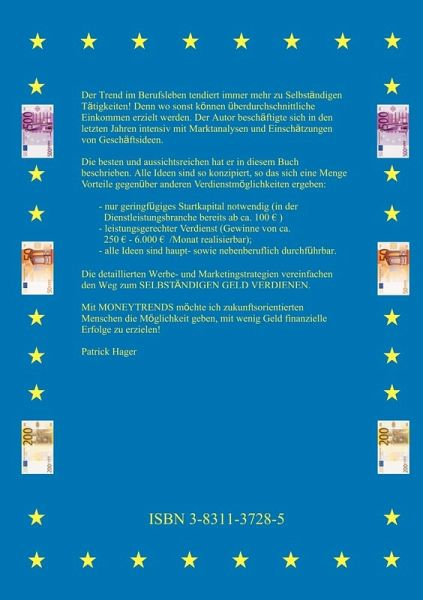 Der Trend im Berufsleben tendiert immer mehr zu selbständigen Tätigkeiten! Denn wo sonst können überdurchschnittliche Einkommen erzielt werden. Der Autor beschäftigte sich in den letzten Jahren intensiv mit Marktanalysen und Einschätzungen von Geschäftsideen. Die besten und aussichtsreichen hat er in diesem Buch beschrieben. Alle Ideen sind so konzipiert, so das sich eine Menge Vorteile gegenüber anderen Verdienstmöglichkeiten ergeben: ----- nur geringfügiges Startkapital notwendig (in der Dienstleistungsbranche bereits ab ca. 100 ?); ----- leistungsgerechter Verdienst (Gewinne von ca. 250 ? - 6.000 ? /Monat realisierbar); ----- alle Ideen sind haupt- sowie nebenberuflich durchführbar. Die detaillierten Werbe- und Marketingstrategien vereinfachen den Weg zum SELBSTÄNDIGEN GELD VERDIENEN. Mit MONEYTRENDS möchte ich zukunftsorientierten Menschen die Möglichkeit geben, mit wenig Geld finanzielle Erfolge zu erzielen! Patrick Hager