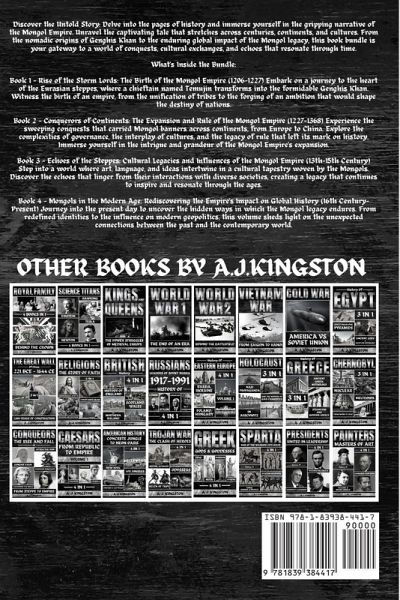 Unveiling the Epic Saga of the Mongol Empire: A Book Bundle of Nomadic Origins to Lasting Global Heritage Discover the Untold Story: Delve into the pages of history and immerse yourself in the gripping narrative of the Mongol Empire. Unravel the captivating tale that stretches across centuries, continents, and cultures. From the nomadic origins of Genghis Khan to the enduring global impact of the Mongol legacy, this book bundle is your gateway to a world of conquests, cultural exchanges, and echoes that resonate through time. What's Inside the Bundle: Book 1 - Rise of the Storm Lords: The Birth of the Mongol Empire (1206-1227) Embark on a journey to the heart of the Eurasian steppes, where a chieftain named Temujin transforms into the formidable Genghis Khan. Witness the birth of an empire, from the unification of tribes to the forging of an ambition that would shape the destiny of nations. Book 2 - Conquerors of Continents: The Expansion and Rule of the Mongol Empire (1227-1368) Experience the sweeping conquests that carried Mongol banners across continents, from Europe to China. Explore the complexities of governance, the interplay of cultures, and the legacy of rule that left its mark on history. Immerse yourself in the intrigue and grandeur of the Mongol Empire's expansion. Book 3 - Echoes of the Steppes: Cultural Legacies and Influences of the Mongol Empire (13th-15th Century) Step into a world where art, language, and ideas intertwine in a cultural tapestry woven by the Mongols. Discover the echoes that linger from their interactions with diverse societies, creating a legacy that continues to inspire and resonate through the ages. Book 4 - Mongols in the Modern Age: Rediscovering the Empire's Impact on Global History (16th Century-Present) Journey into the present day to uncover the hidden ways in which the Mongol legacy endures. From redefined identities to the influence on modern geopolitics, this volume sheds light on the unexpected connections between the past and the contemporary world. Why You'll Love This Bundle: ¿¿¿¿ Comprehensive Exploration: Traverse the entire arc of the Mongol Empire, from its inception to its lasting influence on global history. ¿¿¿¿ Cultural Insights: Immerse yourself in the crossroads of cultures, where the nomadic spirit met sedentary societies, giving rise to a vibrant exchange of ideas and traditions. Don't miss this opportunity to own a comprehensive collection that unravels the epic saga of the Mongol Empire's nomadic origins and its enduring influence on global heritage.