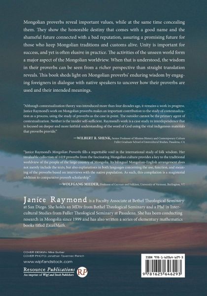 Mongolian proverbs reveal important values, while at the same time concealing them. They show the honorable destiny that comes with a good name and the shameful future connected with a bad reputation, assuring a promising future for those who keep Mongolian traditions and customs alive. Unity is important for success, and yet is often elusive in practice. The activities of the unseen world form a major aspect of the Mongolian worldview. When that is understood, the wisdom in their proverbs can be seen from a richer perspective than straight translation reveals. This book sheds light on Mongolian proverbs' enduring wisdom by engaging foreigners in dialogue with native speakers to uncover how their proverbs are used and their intended meanings.