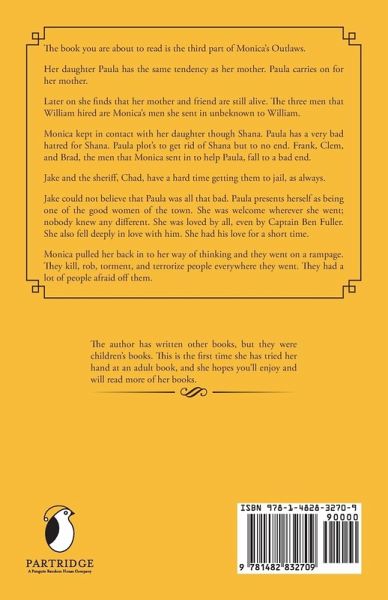 The book you are about to read is the third part of Monica's Outlaws. Her daughter Paula has the same tendency as her mother. Paula carries on for her mother. Later on she finds that her mother and friend are still alive. The three men that William hired are Monica's men she sent in unbeknown to William. Monica kept in contact with her daughter though Shana. Paula has a very bad hatred for Shana. Paula plot's to get rid of Shana but to no end. Frank, Clem, and Brad, the men that Monica sent in to help Paula, fall to a bad end. Jake and the sheriff, Chad, have a hard time getting them to jail, as always. Jake could not believe that Paula was all that bad. Paula presents herself as being one of the good women of the town. She was welcome wherever she went; nobody knew any different. She was loved by all, even by Captain Ben Fuller. She also fell deeply in love with him. She had his love for a short time. Monica pulled her back in to her way of thinking and they went on a rampage. They kill, rob, torment, and terrorize people everywhere they went. They had a lot of people afraid off them.