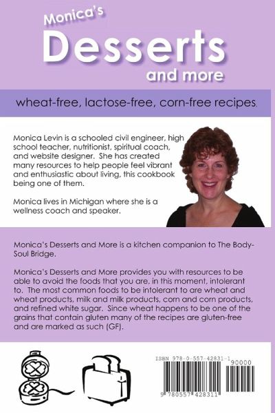 By using this cookbook you can still eat your favorite foods, even if you have food allergies! "MONICA'S DESSERTS AND MORE: wheat-free and lactose-reduced" contains recipes for muffins, pancakes, yeast breads, quick breads, pizza, breakfast cereals, icings, cakes, pie crusts, pies, cookies, squares, and puddings. All of the recipes are free of wheat, milk products (except butter), corn, and refined white sugar. Over 90 percent of the recipes are also gluten-free.