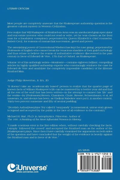 Most people are completely unaware that the Shakespeare authorship question is the greatest cultural mystery in Western Civilization. Few realize that Will Shakspere of Stratford-on-Avon was an uneducated grain speculator and real estate investor who could not read or write, yet he was chosen as the front man for a fraudulent conspiracy perpetrated by Queen Elizabeth¿s chief counselor, Robert Cecil, for reasons of monarchial succession, greed and power. The astonishing power of Conventional Wisdom has kept the ruse going, perpetrated by Professors of English who cannot break the tenacious shackles of their guild mythology and thus refuse to believe the reams of authoritative evidence discovered in the past century in favor of Edward de Vere, 17th Earl of Oxford, as Shakespeare. Volume 10 of this anthology series¿Moniment¿ contains eighteen brilliant, compelling articles by highly qualified authorship experts who convincingly reinforce the case for Edward de Vere and annihilate the completely impossible candidacy of the illiterate Stratford Man. Judge Philip Howerton, Jr. BA, JD: ¿It doesn¿t take an ¿academically based¿ person to realize that the quarter page of known facts of William Shakspere¿s life can be mastered by a twelve year old and that all the rest of the stuff that has been written¿in the attempt to connect his ¿life¿ and the works¿by [Professors] Brown, Chambers, Chute, Rowse, Schoenbaum, et al, ad nauseam, is, and always has been, as Vladimir Nabokov once put it, in another context, ¿thirty-two percent nonsense and fifty of neutral padding.¿ ¿[Scottish Author]Josephine Tey called it ¿tonypandy¿ [a nonsensical, untrue story grown to legend and accepted by the public in the face of all evidence to the contrary].¿ Michael H. Hart, Ph.D. in Astrophysics, Princeton. Author of The 100: A Ranking of the Most Influential Persons in History: ¿I made a serious error in the first edition when, without carefully checking the facts, I simply ¿followed the crowd¿ and accepted the Stratford man as the author of the [Shakespeare] plays. Since then I have carefully examined the arguments on both sides of the question and have concluded that the weight of the evidence is heavily against the Stratford man and in favor of de Vere.¿
