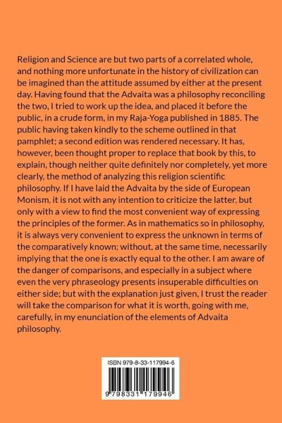 Religion and Science are but two parts of a correlated whole, and nothing more unfortunate in the history of civilization can be imagined than the attitude assumed by either at the present day. Having found that the Advaita was a philosophy reconciling the two, I tried to work up the idea, and placed it before the public, in a crude form, in my Raja-Yoga published in 1885. The public having taken kindly to the scheme outlined in that pamphlet; a second edition was rendered necessary. It has, however, been thought proper to replace that book by this, to explain, though neither quite definitely nor completely, yet more clearly, the method of analyzing this religion scientific philosophy. If I have laid the Advaita by the side of European Monism, it is not with any intention to criticize the latter, but only with a view to find the most convenient way of expressing the principles of the former. As in mathematics so in philosophy, it is always very convenient to express the unknown in terms of the comparatively known; without, at the same time, necessarily implying that the one is exactly equal to the other. I am aware of the danger of comparisons, and especially in a subject where even the very phraseology presents insuperable difficulties on either side; but with the explanation just given, I trust the reader will take the comparison for what it is worth, going with me, carefully, in my enunciation of the elements of Advaita philosophy.