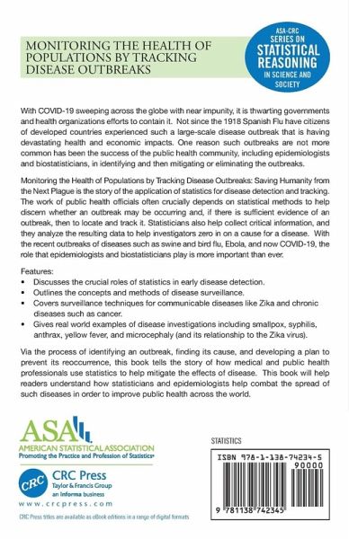 With COVID-19 sweeping across the globe with near impunity, it is thwarting governments and health organizations efforts to contain it. Not since the 1918 Spanish Flu have citizens of developed countries experienced such a large-scale disease outbreak that is having devastating health and economic impacts. One reason such outbreaks are not more common has been the success of the public health community, including epidemiologists and biostatisticians, in identifying and then mitigating or eliminating the outbreaks. Monitoring the Health of Populations by Tracking Disease Outbreaks: Saving Humanity from the Next Plague is the story of the application of statistics for disease detection and tracking. The work of public health officials often crucially depends on statistical methods to help discern whether an outbreak may be occurring and, if there is sufficient evidence of an outbreak, then to locate and track it. Statisticians also help collect critical information, and they analyze the resulting data to help investigators zero in on a cause for a disease. With the recent outbreaks of diseases such as swine and bird flu, Ebola, and now COVID-19, the role that epidemiologists and biostatisticians play is more important than ever. Features: · Discusses the crucial roles of statistics in early disease detection. · Outlines the concepts and methods of disease surveillance. · Covers surveillance techniques for communicable diseases like Zika and chronic diseases such as cancer. · Gives real world examples of disease investigations including smallpox, syphilis, anthrax, yellow fever, and microcephaly (and its relationship to the Zika virus). Via the process of identifying an outbreak, finding its cause, and developing a plan to prevent its reoccurrence, this book tells the story of how medical and public health professionals use statistics to help mitigate the effects of disease. This book will help readers understand how statisticians and epidemiologists help combat the spread of such diseases in order to improve public health across the world.