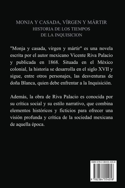 "Monja y casada, virgen y mártir" es una novela escrita por el autor mexicano Vicente Riva Palacio y publicada en 1868. Situada en el México colonial, la historia se desarrolla en el siglo XVII y sigue, entre otros personajes, las desventuras de doña Blanca, quien debe enfrentar a la Inquisición. Además, la obra de Riva Palacio es conocida por su crítica social y su estilo narrativo, que combina elementos históricos y ficticios para ofrecer una visión profunda y crítica de la sociedad mexicana de aquella época.