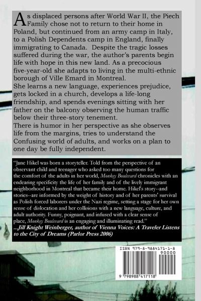 As displaced persons after World War II, the Piech Family chose not to return to their home in Poland, but continued from an army camp in Italy, to a Polish Dependents camp in England, finally immigrating to Canada. Despite the tragic losses suffered during the war, the author's parents begin life with hope in this new land. As a precocious five-year-old she adapts to living in the multi-ethnic borough of Ville Emard in Montreal. She learns a new language, experiences prejudice, gets locked in a church, develops a life-long friendship, and spends evenings sitting with her father on the balcony observing the human traffic below their three-story tenement. There is humor in her perspective as she observes life from the margins, tries to understand the confusing world of adults, and works on a plan to one day be fully independent.