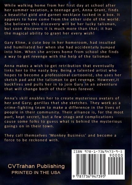 While walking home from her first day at school after her summer vacation, a teenage girl, Anna Grant, finds a beautiful gold and garnet necklace tucked in a box. It appears to have come from the other side of the world. She believes this discovery will be her lucky talisman, but soon discovers it is much more than that; it has the magical ability to grant her every wish! Gary Kline, a cute boy in her homeroom, had insulted and humiliated her when she had accidentally bumped into him. When she arrives home from school she finds a way to get revenge with the help of the talisman. Anna makes a wish to get retribution that eventually links her to the nasty boy. Being a talented artist who hopes to become a professional cartoonist, she uses her sketch pad and the talisman to get revenge. However, it backfires and pulls her in to join Gary in an adventure that will change both of their lives forever. Anna's skill enables her to create mysterious avatars of her and Gary; gorillas that she sketches. They work as a crime-fighting team to make a difference in the lives of people in their community. Their alliance is, for the most part, kept secret, but a few snags and complications cause some folks to guess what is behind the mysterious goings on in their town. They call themselves 'Monkey Business' and become a force to be reckoned with.