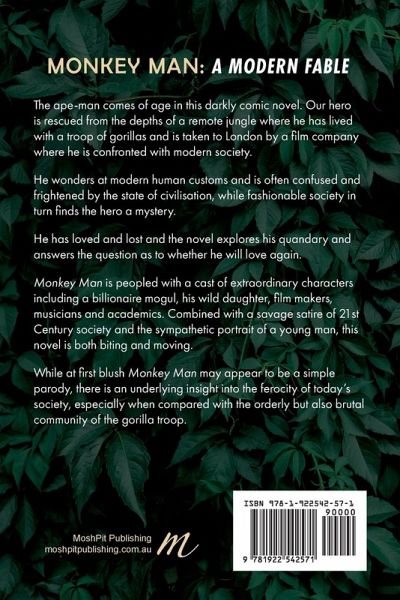 The ape-man comes of age in this darkly comic novel. Our hero is rescued from the depths of a remote jungle where he has lived with a troop of gorillas and is taken to London by a film company where he is confronted with modern society. He wonders at modern human customs and is often confused and frightened by the state of civilisation, while fashionable society in turn finds the hero a mystery. He has loved and lost and the novel explores his quandary and answers the question as to whether he will love again. Monkey Man is peopled with a cast of extraordinary characters including a billionaire mogul, his wild daughter, film makers, musicians and academics. Combined with a savage satire of 21st Century society and the sympathetic portrait of a young man, this novel is both biting and moving. While at first blush Monkey Man may appear to be a simple parody, there is an underlying insight into the ferocity of today's society, especially when compared with the orderly but also brutal community of the gorilla troop.