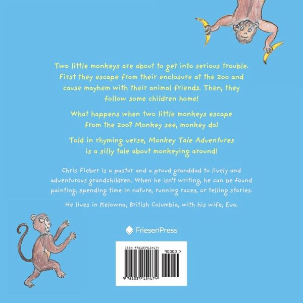 Two little monkeys are about to get into serious trouble. First they escape from their enclosure at the zoo and cause mayhem with their animal friends. Then, they follow some children home! What happens when two little monkeys escape from the zoo? Monkey see, monkey do! Told in rhyming verse, Monkey Tale Adventures is a silly tale about monkeying around!