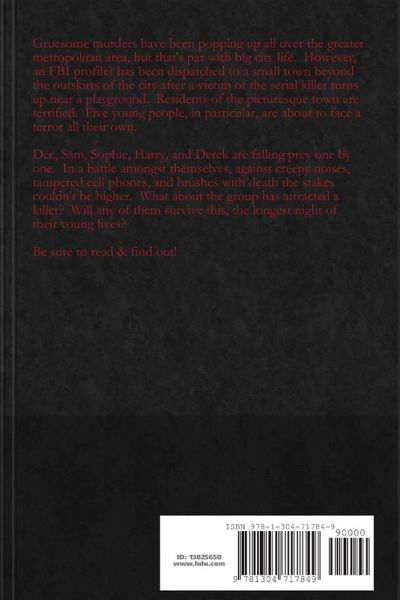Gruesome murders have been popping up all over the greater metropolitan area, but that's par with big city life. However, an FBI profiler has been dispatched to a small town beyond the outskirts of the city after a victim of the serial killer turns up near a playground. Residents of the picturesque town are terrified. Five young people, in particular, are about to face a terror all their own. Dee, Sam, Sophie, Harry, and Derek are falling prey one by one. In a battle amongst themselves, against creepy noises, tampered cell phones, and brushes with death the stakes couldn't be higher. What about the group has attracted a killer? Will any of them survive this, the longest night of their young lives? Be sure to read & find out!
