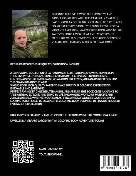 Immerse yourself in the vibrant world brimming with playfulness and intrigue in "Monkeys & Jungle Dwellers: A Lively Large Print A4 Coloring Book Adventure"! This extraordinary colouring book invites kids of an older age, teens, and adults to explore and delight in the captivating charm of lively monkeys and diverse jungle creatures. Key Features:39 painstakingly created, large print A4 illustrations, showcasing monkeys in their animated treetops and jungle creatures in their rich habitats. Suitable for older kids, teens, and adults alike, providing endless hours of relaxation and creative expression. Printed on single-sided pages to prevent bleed-through and allow easy removal for display. High-quality paper, perfectly suited for colouring with coloured pencils, markers, or crayons. From lively monkeys swinging effortlessly through the jungle canopy to diverse creatures uncovering wonders in dense undergrowth, "Monkeys & Jungle Dwellers: A Lively Large Print A4 Coloring Book Adventure" unveils a wide range of exciting scenarios that highlight the charm and mystery of these enchanting creatures. This colouring book serves as a perfect gift for birthdays, holidays, or as a special surprise for any budding artist or wildlife enthusiast. Ignite their creativity, fuel their imagination, and let them dive into the thrilling realm of monkeys and jungle creatures. Grab your copy of "Monkeys & Jungle Dwellers: A Lively Large Print A4 Coloring Book Adventure" today, and let the vibrant world of monkeys and jungle dwellers burst into life on every page!
