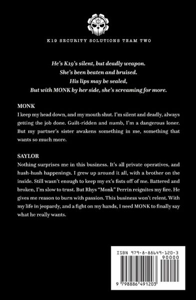 He's K19's silent, but deadly weapon. She's been beaten and bruised. His lips may be sealed, But with MONK by her side, she's screaming for more. MONK I keep my head down, and my mouth shut. I'm silent and deadly, always getting the job done. Guilt-ridden and numb, I'm a dangerous loner. But my partner's sister awakens something in me, something that wants so much more. SAYLOR Nothing surprises me in this business. It's all private operatives, and hush-hush happenings. I grew up around it all, with a brother on the inside. Still wasn't enough to keep my ex's fists off of me. Battered and broken, I'm slow to trust. But Rhys "Monk" Perrin reignites my fire. He gives me reason to burn with passion. This business won't relent. With my life in jeopardy, and a fight on my hands, I need MONK to finally say what he really wants. While each book in the K19 Security Solutions series is a standalone with its own HEA, they may be more enjoyable read in order.