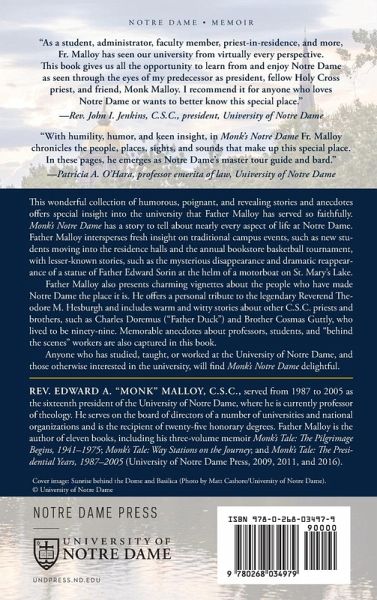 "This book was a labor of love, and I hope my readers can share my pleasure in, once again, telling the stories of a place dear to us all." -Father "Monk" Malloy, from the introduction This wonderful collection of humorous, poignant, and revealing stories and anecdotes offers special insight into the university that Father Malloy has served so faithfully. Monk's Notre Dame has a story to tell about nearly every aspect of life at Notre Dame. Father Malloy intersperses fresh insight on traditional campus events, such as new students moving into the residence halls and the annual bookstore basketball tournament, with lesser-known stories, such as the mysterious disappearance and dramatic reappearance of a statue of Father Edward Sorin at the helm of a motorboat on St. Mary's Lake. Father Malloy also presents charming vignettes about the people who have made Notre Dame the place it is. He offers a personal tribute to the legendary Reverend Theodore M. Hesburgh and includes warm and witty stories about other C.S.C. priests and brothers, such as Charles Doremus ("Father Duck") and Brother Cosmas Guttly, who lived to be ninety-nine. Memorable anecdotes about professors, students, and "behind the scenes" workers are also captured in this book. Anyone who has studied, taught, or worked at the University of Notre Dame, and those otherwise interested in the university, will find Monk's Notre Dame delightful.
