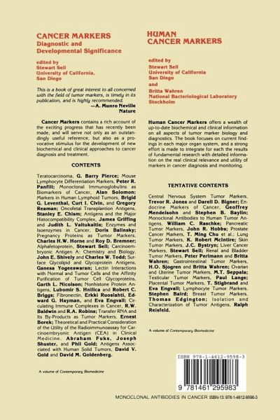 1 Monoclonal Antibody Defined Antigens on Animal Tumors.- 1. Introduction.- 2. Antigen Expression on Chemically Induced Tumors.- 2.1. Murine Tumors.- 2.2. Rat Tumors.- 2.3. Guinea Pig Tumors.- 3. Use of Monoclonal Antibodies in Tumor Localization and Therapy.- 3.1. In Vivo Localization of Monoclonal Antibodies in Experimental Tumors.- 3.2. Serotherapy Using Antitumor Monoclonal Antibodies.- 3.3. Therapy Using Antitumor Monoclonal Antibodies Conjugated to Cytotoxic Agents.- 4. Conclusion.- References.- 2 Monoclonal Carcinoembryonic Antigen Antibodies.- 1. Introduction.- 2. The Development of Monoclonal CEA Immunoassays.- 2.1. General Concepts of Monoclonal Antibody Methodology.- 2.2. Experimental and Clinical Experience with Monoclonal CEA Antibodies.- 3. Monoclonal Antibodies in the Immunohistological Evaluation of CEA.- 4. Monoclonal Anti-CEA Antibodies in Tumor Imaging.- 5. Immunotherapy with Monoclonal CEA Antibodies.- 6. Summary.- References.- 3 Monoclonal Antibodies to Alphafetoprotein and Regulation of AFP Gene Expression.- 1. Introduction.- 2. Monoclonal Antibodies to AFP.- 2.1. ELISA Using Monoclonal Antibodies.- 2.2. Immune Localization Using Anti-AFP.- 2.3. Radioimmunescintigraphy.- 2.4. Immunotherapy.- 3. Control of AFP Gene Expression.- 3.1. AFP and Albumin Gene Expression During Development.- 3.2. AFP and Albumin Gene Structure.- 3.3. AFP and Albumin Gene Expression and Methylation.- 4. Summary.- References.- 4 Human Chorionic Gonadotropin Detection with Monoclonal Antibodies.- 1. Introduction: hCG Chemistry and Immunochemistry with Antisera.- 2. Description of Monoclonal Antibodies to hCG.- 2.1. Affinity, Isotype, Subclass, and Cross-Reactivity of Antibodies.- 2.2. Topological Mapping of Monoclonal Antibodies: Relative Orientation of Epitopes.- 2.3. Biological Effects of Monoclonal Antibodies Against hCG.- 2.4. Special Properties of Monoclonal Antibodies to hCG: Synergistic Effects.- 3. Immunoassays with Monoclonal Antibodies to hCG.- 3.1. Description of Commercial Immunoassays for hCG Employing Monoclonal Antibodies.- 3.2. Research Immunoassays for hCG.- 4. In Vivo Immunodetection of Tumors.- 5. Immunocytochemistry with Monoclonal Antibodies to hCG.- 6. Summary.- References.- 5 Products of the Major Histocompatibility Complex on Tumor Cells.- 1. Introduction.- 2. Variable Expression of MHC Antigens by Tumor Cells.- 2.1. Inducible MHC Antigens on Murine Tumors Cells.- 2.2. Inducible MHC Antigens on Human Tumors.- 2.3. Implications for Human Tumor Immunology.- 3. Abnormal Expression of MHC Antigens by Tumor Cells.- 3.1. Abnormal Expression of MHC Antigens on Murine Tumor Cells.- 3.2. Abnormal Expression of MHC Antigens on Human Tumor Cells.- 4. Conclusions.- References.- 6 Monoclonal Antibodies: Probes for the Study of Malignant T Cells.- 1. Introduction.- 2. Monoclonal Antibodies as Probes for the Study of Malignant T Cells.- 3. Normal T-Cell Maturation as Defined by Monoclonal Antibodies.- 4. Phenotypic Analysis of Malignant T Cells in Defined Clinical Syndromes.- 4.1. T-Cell Acute Lymphoblastic Leukemia.- 4.2. T-Cell Lymphoblastic Lymphoma.- 4.3. T-Cell Prolymphocytic Leukemia.- 4.4. Cutaneous T-Cell Lymphoma.- 4.5. T-Cell Chronic Lymphocytic Leukemia.- 4.6. IgG Fc Receptor Beraing (TG) Lymphoproliferative Disease.- 4.7. Hairy Cell Leukemia.- 4.8. HTLV-Associated Japanese, Caribbean, and American Adult T-Cell Leukemia/Lymphoma (ATL).- 4.9. Diffuse Lymphomas.- 4.10. T-Cell "Premalignant" Proliferative Disease.- 4.11. Thymoma.- 5. Summary and Conclusions.- References.- 7 Antigenic Markers on Normal and Malignant BCells.- 1. Introduction.- 2. Antigenic Markers on Normal B Cells.- 3. Antigenic Markers on Malignant B Cells.- Bibliography for Further Reading.- 8 Nonlymphoblastic Leukemia-Associated Antigens Identified by Monoclonal Antibodies.- 1. Introduction.- 2. Myeloid-Associated Antigens Expressed by Normal Hematopoietic Cells and Cell Lines.- 2.1. Monoclonal Antibodies to Antigens Expressed Primarily on Granulocytes.- 2.2. Monoclonal Antibodies to Antigens Primarily Expressed by Monocytes.- 2.3. Monoclonal Antibodies to Antigens Associated with Granulocytes and Monocytes.- 2.4. Monoclonal Antibodies to Antigens Primarily Expressed on Immature Granulocytes and Monocytes.- 2.5. Antibodies Against Erythroid and Megakaryocytic Lineage-Associated Antigens.- 2.6. Myeloid-Associated Antigens Expressed by Hematopoietic Progenitors.- 2.7. Expression of Myeloid-Associated Antigens During Ontogeny and Phylogeny.- 2.8. Myeloid-Associated Antigens on Human Myeloid Cell Lines.- 3. Expression of Myeloid-Associated Antigens by Myeloid Leukemias.- 3.1. Diagnosis of Acute Nonlymphoblastic Leukemia Using Monoclonal Antibodies: Discrimination from ALL.- 3.2. Subsets of Acute Nonlymphoblastic Leukemia Defined by Monoclonal Antibodies.- 3.3. Prognostic Implications of Cell Surface Phenotype.- 4. Monoclonal Antibodies as Probes of Leukemic Stem Cell Phenotype and Differentiation.- 5. Therapy of Myeloid Leukemias Using Antibodies to Leukemia-Associated Antigens.- 6. Conclusions.- References.- 9 Monoclonal Antibodies as Probes for the Molecular Structure and Biological Function of Melanoma-Associated Antigens.- 1. Introduction.- 2. Immunological Characterization of Monoclonal Antibodies.- 3. Immunochemical and Molecular Profiles of Human Melanoma-Associated Antigens.- 3.1. Glycoproteins.- 3.2. Glycolipids.- 4. Biosynthesis and Structure of Melanoma-Associated Antigens.- 5. Function of Melanoma Antigens Defined by Monoclonal Antibodies.- 5.1. In Vitro Studies.- 5.2. In Vivo Studies.- 6. Conclusions.- References.- 10 Lung Cancer Markers as Detected by Monoclonal Antibodies.- 1. Introduction.- 2. Methods.- 3. Characterization Studies.- 4. Monoclonal Antibodies to Small-Cell Lung Cancer.- 4.1. Analysis of Antigen Expression in Small-Cell Lung Cancer.- 5. Monoclonal Antibodies to Nonsmall-Cell Lung Cancer.- 6. Monoclonal Antibodies to Defined Proteins of Lung Cancer.- 7. Imaging Lung Cancer with Monoc