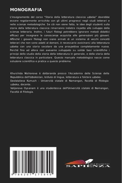 L'insegnamento del corso ¿Storia della letteratura classica uzbekä dovrebbe essere regolarmente arricchito con gli ultimi progressi negli studi letterari e nelle scienze metodologiche. Se ciò non viene fatto, le idee degli studenti sulla storia della letteratura classica rimarranno indietro rispetto allo sviluppo della scienza letteraria. Inoltre, i futuri filologi potrebbero ignorare metodi didattici efficaci per insegnare la conoscenza acquisita alle generazioni più giovani. Affinché i giovani filologi non siano armati di un sistema di vecchi concetti letterari che non sono adatti al domani, è necessario avvicinarsi alla letteratura uzbeka con una storia secolare da una prospettiva completamente nuova. Perché fino ad allora non avevamo sviluppato su solide basi scientifiche i principi dello studio della storia della letteratura in generale, e della storia della letteratura classica in particolare. Questo manuale metodologico nasce come soluzione scientifica e pratica a questo problema.