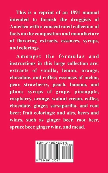 This is a reprint of an 1891 manual intended to furnish the druggists of America with a concentrated collection of facts on the composition and manufacture of flavoring extracts, essences, syrups, and colorings. Amongst the formulas and instructions in this large collection are: extracts of vanilla, lemon, orange, chocolate, and coffee; essences of melon, pear, strawberry, peach, banana, and plum; syrups of grape, pineapple, raspberry, orange, walnut cream, coffee, chocolate, ginger, sarsaparilla, and root beer; fruit colorings; and ales, beers and wines, such as ginger beer, root beer, spruce beer, ginger wine, and mead.