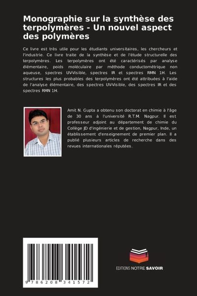 Ce livre est très utile pour les étudiants universitaires, les chercheurs et l'industrie. Ce livre traite de la synthèse et de l'étude structurelle des terpolymères. Les terpolymères ont été caractérisés par analyse élémentaire, poids moléculaire par méthode conductométrique non aqueuse, spectres UV-Visible, spectres IR et spectres RMN 1H. Les structures les plus probables des terpolymères ont été attribuées à l'aide de l'analyse élémentaire, des spectres UV-Visible, des spectres IR et des spectres RMN 1H.