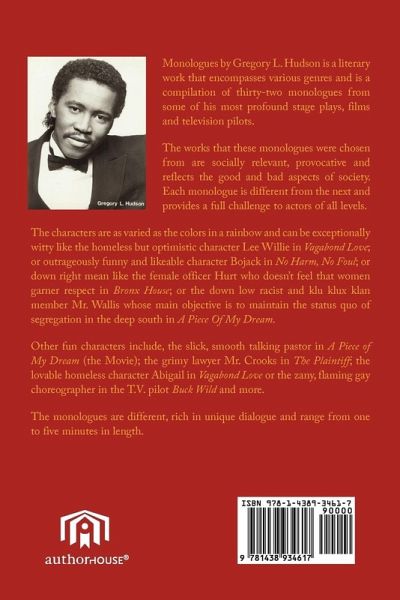 Monologues by Gregory L. Hudson is a compilation of thirty-two monologues from some of his most profound stage plays, films and television pilots. The literary works that these monologues were chosen from are socially relevant, provocative and reflects the good and bad aspects of society. Each monologue is different from the next and provides a unique challenge to actors of all levels. The characters are as varied as the colors in a rainbow and can be exceptionally witty like the homeless but optimistic character Lee Willie in Vagabond Love; or outrageously funny and likeable character Bojack in No Harm, No Foul; to the down right mean female correction officer Hurt character who doesn't feel that women garner respect in Bronx House; or the respected and deceptive racist bank manager Mr. Wallis whose main objective is to maintain the status quo of segregation in the deep south in A Piece Of My Dream. Other fun characters includes, the slick, smooth talking pastor in A Piece of My Dream (the Movie); the grimy lawyer Mr. Crooks in The Plaintiff; the lovable homeless character Abigail in Vagabond Love; the wacky, over the top judge who fancys himself as the sheriff, mayor, judge and everything else in No Harm, No Foul, to the zany, flaming gay choreographer in the T.V. pilot Buck Wild and more. The monologues are different, rich in unique dialogue and range from one to five minutes in length.