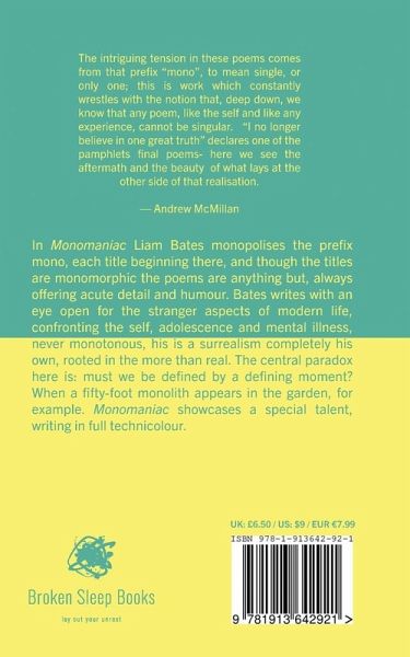 In Monomaniac Liam Bates monopolises the prefix mono, each title beginning there, and though the titles are monomorphic the poems are anything but, always offering acute detail and humour. Bates writes with an eye open for the stranger aspects of modern life, confronting the self, adolescence and mental illness, never monotonous, his is a surrealism completely his own, rooted in the more than real. The central paradox here is: must we be defined by a defining moment? When a fifty-foot monolith appears in the garden, for example. Monomaniac showcases a special talent, writing in full technicolour.