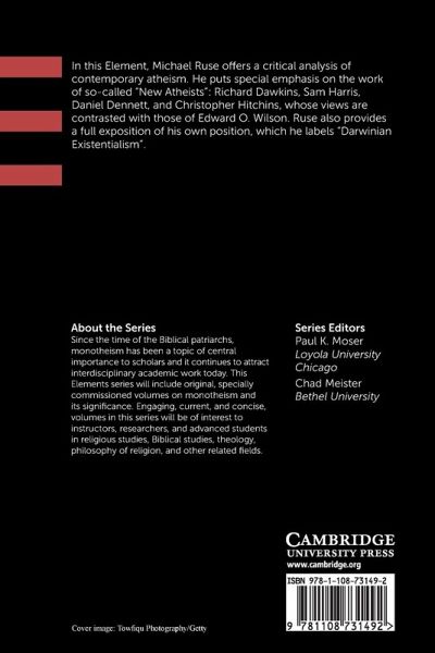 In this Element, Michael Ruse offers a critical analysis of contemporary atheism. He puts special emphasis on the work of so-called 'New Atheists': Richard Dawkins, Sam Harris, Daniel Dennett, and Christopher Hitchins, whose views are contrasted with those of Edward O. Wilson.