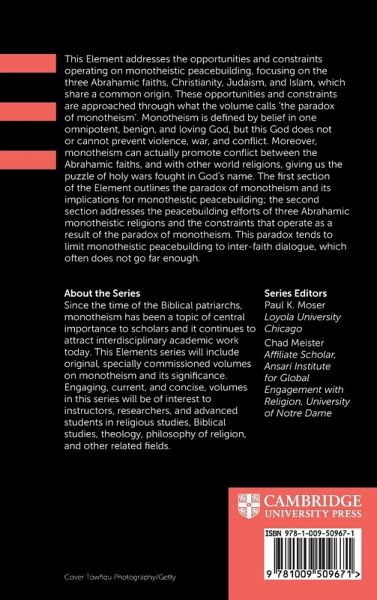 This Element addresses the opportunities and constraints operating on monotheistic peacebuilding, focusing on the three Abrahamic faiths, Christianity, Judaism, and Islam, which share a common origin. These opportunities and constraints are approached through what the volume calls 'the paradox of monotheism'. Monotheism is defined by belief in one omnipotent, benign, and loving God, but this God does not or cannot prevent violence, war, and conflict. Moreover, monotheism can actually promote conflict between the Abrahamic faiths, and with other world religions, giving us the puzzle of holy wars fought in God's name. The first section of the Element outlines the paradox of monotheism and its implications for monotheistic peacebuilding; the second section addresses the peacebuilding efforts of three Abrahamic monotheistic religions and the constraints that operate as a result of the paradox of monotheism. This paradox tends to limit monotheistic peacebuilding to inter-faith dialogue, which often does not go far enough.