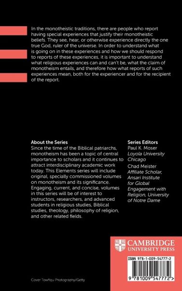In the monotheistic traditions, there are people who report having special experiences that justify their monotheistic beliefs. They see, hear, or otherwise experience directly the one true God, ruler of the universe. In order to understand what is going on in these experiences and how we should respond to reports of these experiences, it is important to understand what religious experiences can and can't be, what the claim of monotheism entails, and therefore how what reports of such experiences mean, both for the experiencer and for the recipient of the report.